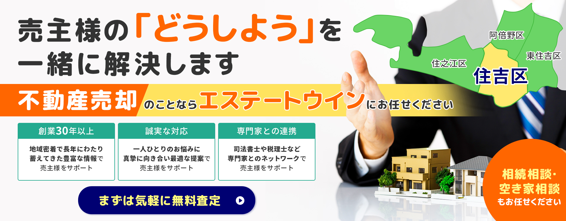 「売主様に寄り添う」をモットーに、長年にわたり住吉区を中心に地域密着で不動産業を営んでいます。これまで蓄積した地域の相場情報や特性をもとに売主様に最適な売却提案をさせていただきます。売主様の事情にあわせて仲介による売却だけでなく直接買取にも対応しています。